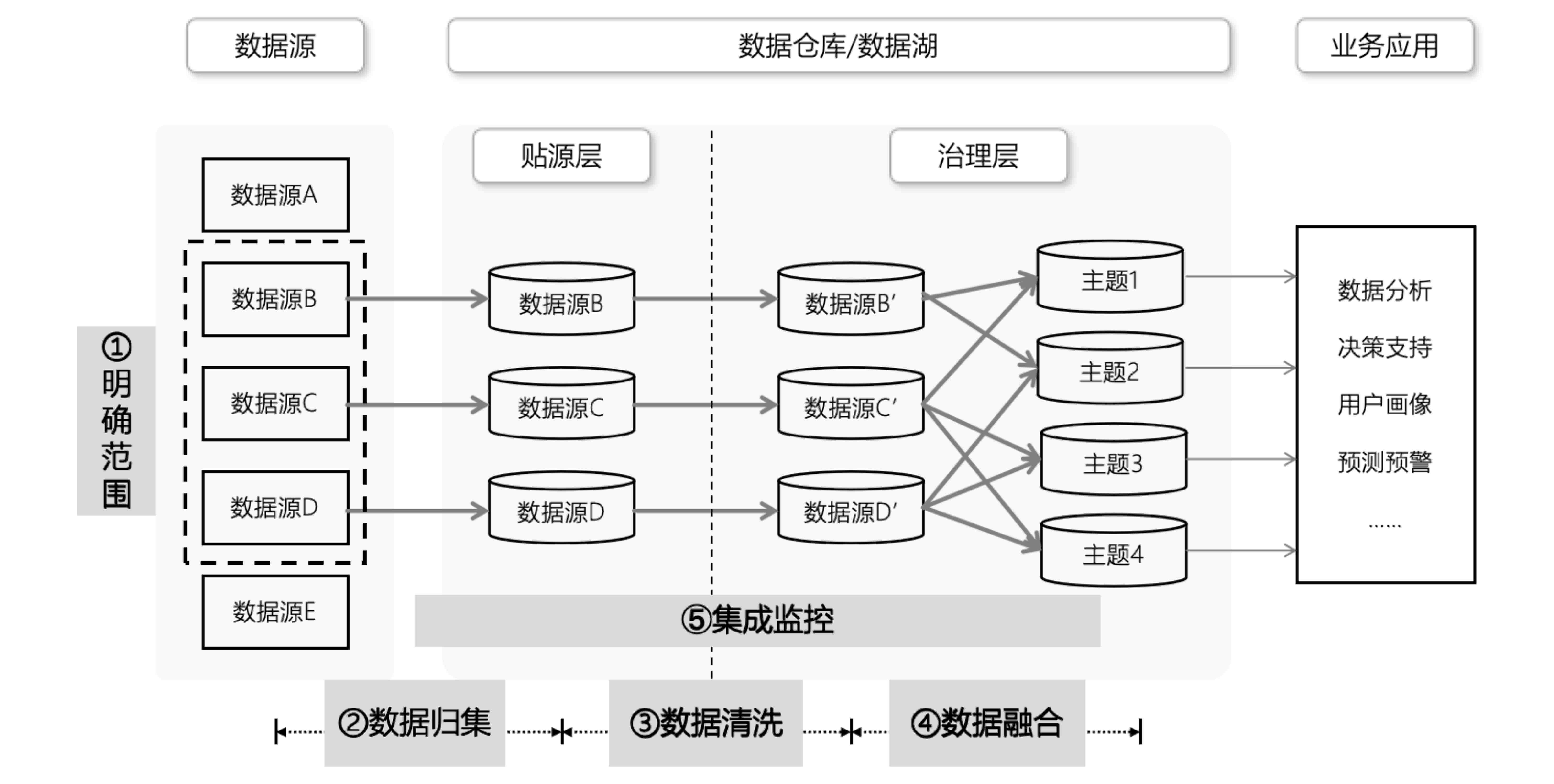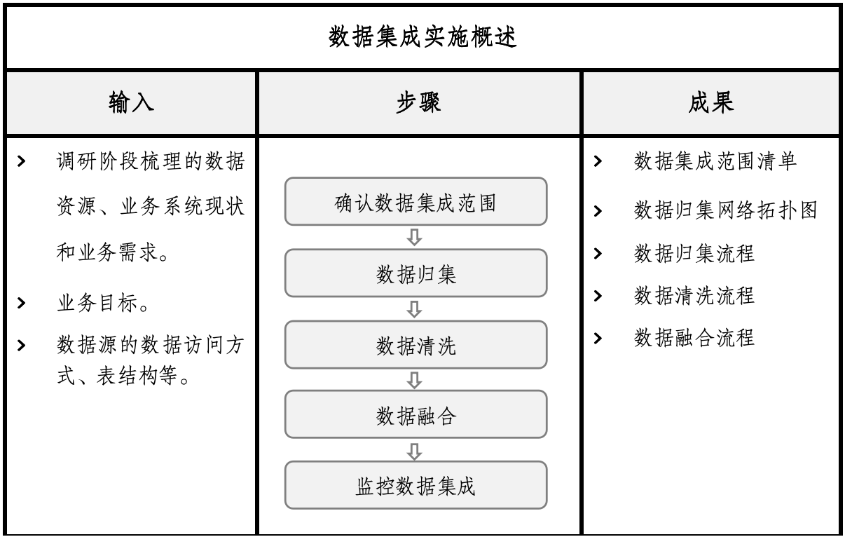 数据集成实施的整体思路是“以终为始、循序渐进”,从数据源到数据仓库/数据湖逐步进行归集、清洗和融合,最终服务于业务应用。
