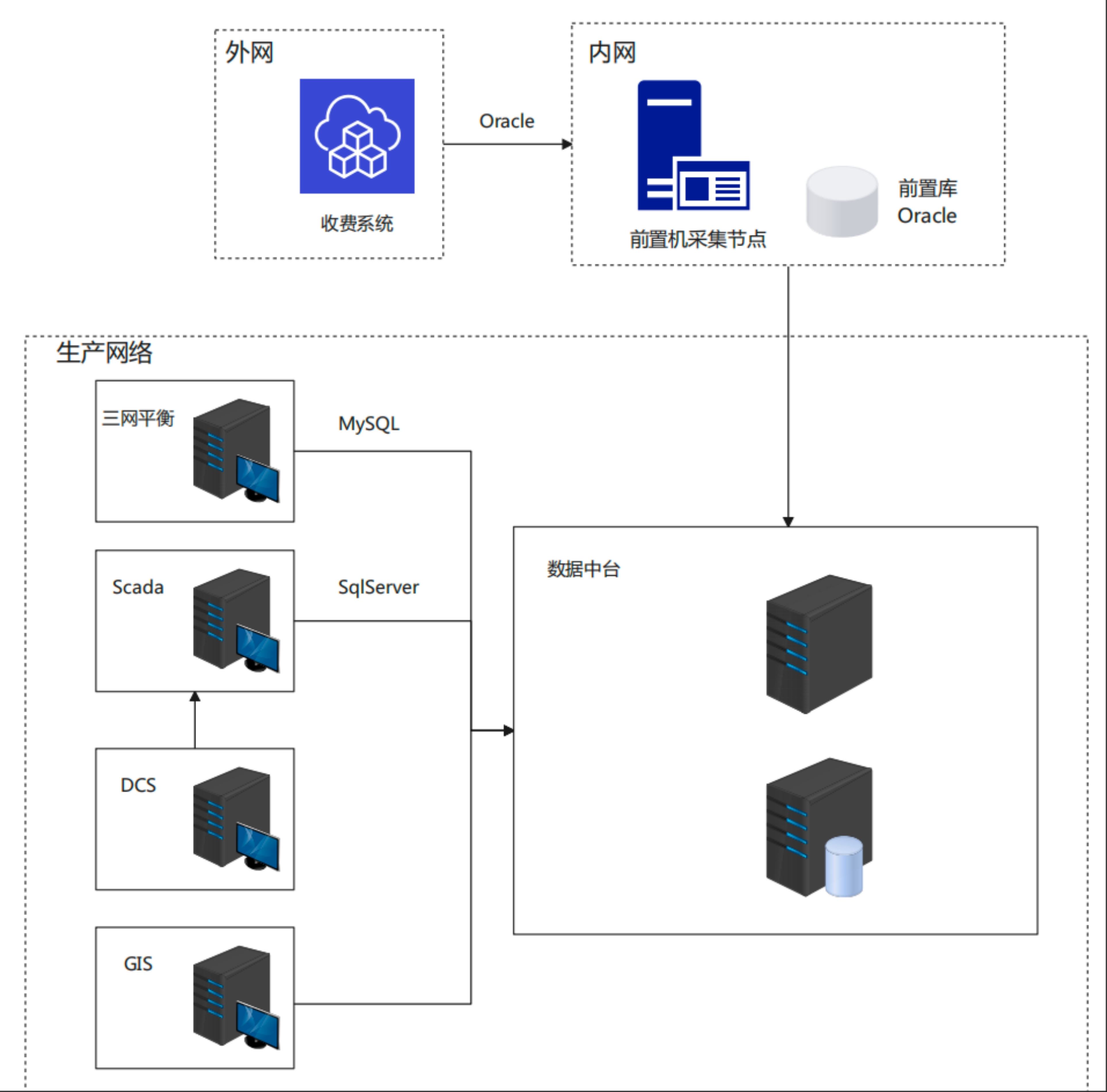 根据调研阶段所获得的数据资源、业务系统现状和业务需求,明确集成的数据范围。结合数据源分析情况,绘制数据归集网络拓扑图,以下为某热力公司的网络拓扑图示例。