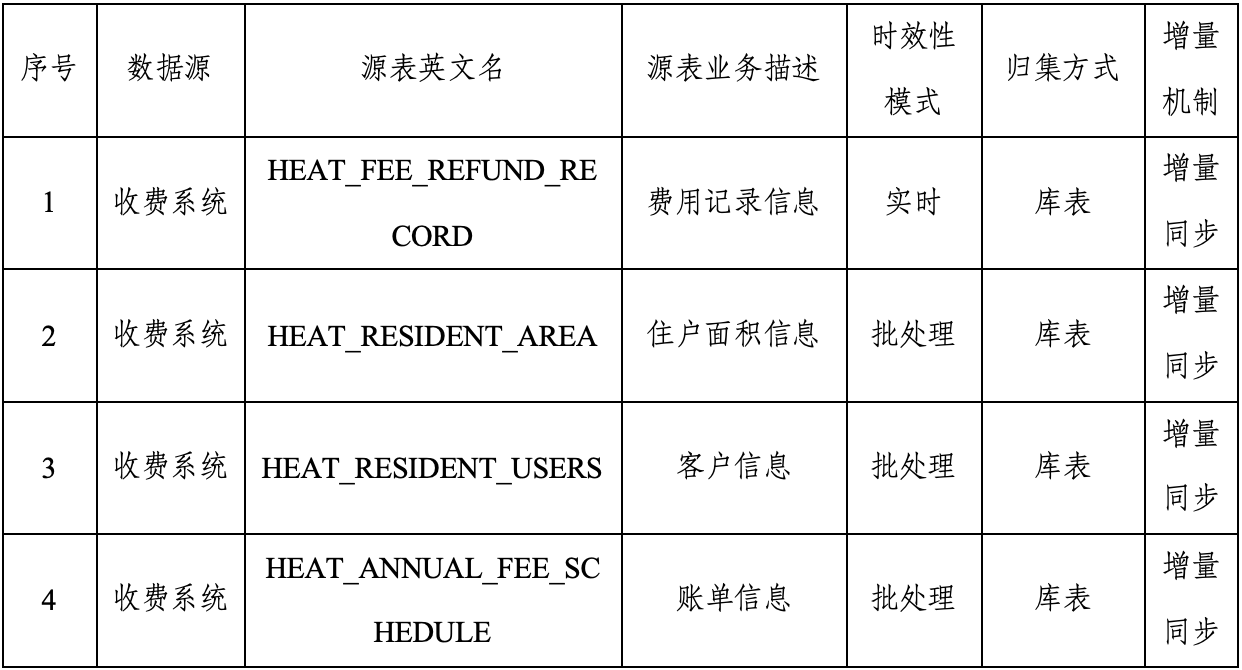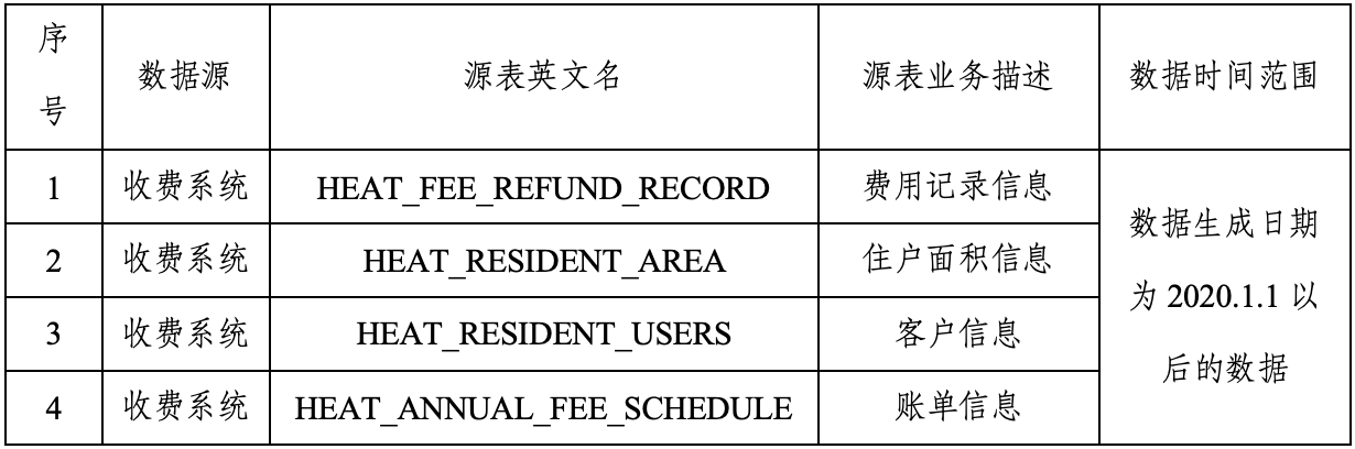 方式二,优先选择核心业务系统中的关键数据表。基于数据资源梳理过程获得的核心数据资源表,综合考虑业务需求、未来应用场景、系统间的关联性、数据量情况等因素,选择具有高业务价值和应用潜力的数据表进行优先集成。如下表,为某热力公司收费系统的核心数据资源表集成范围清单示例。