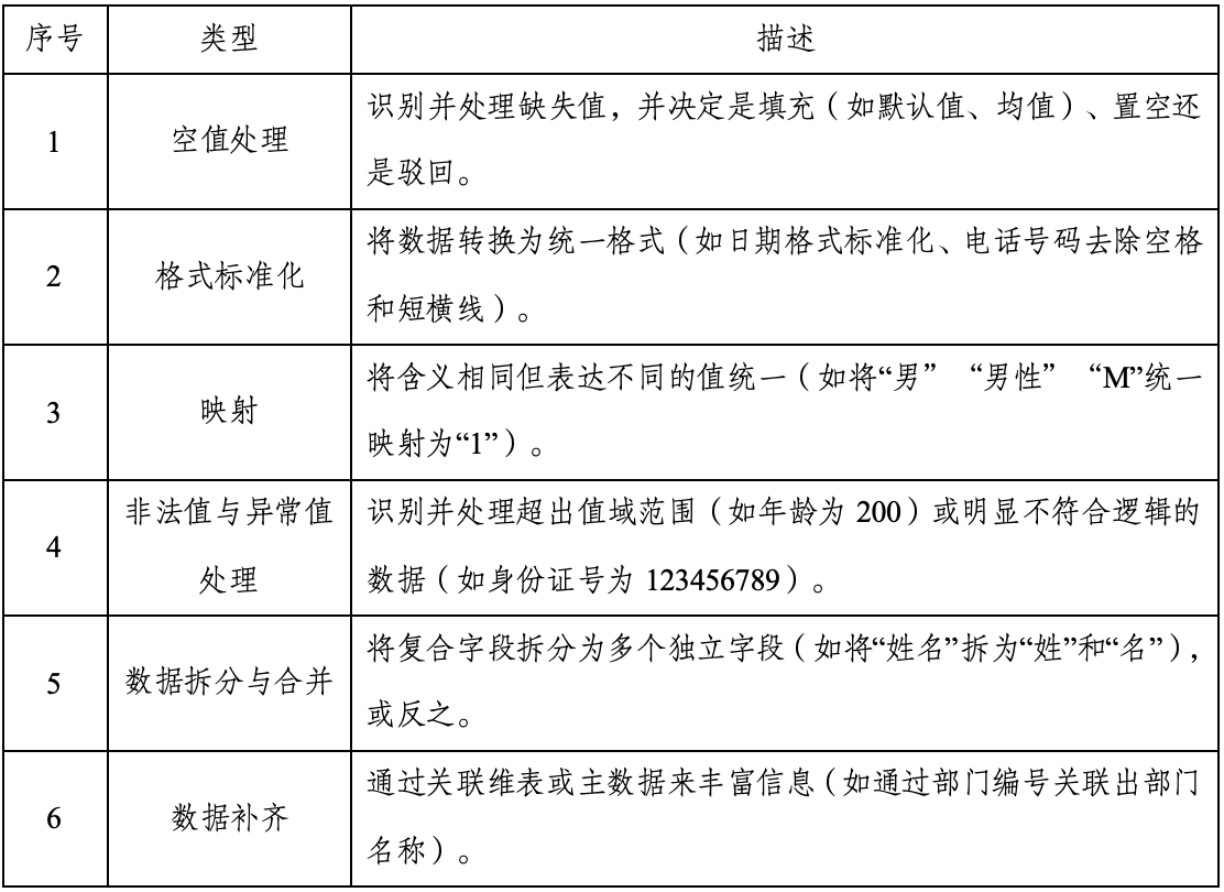 数据清洗和转换类型包括但不限于空值处理、格式标准化、映射、非法值与异常值处理、数据拆分与合并、数据补齐等。