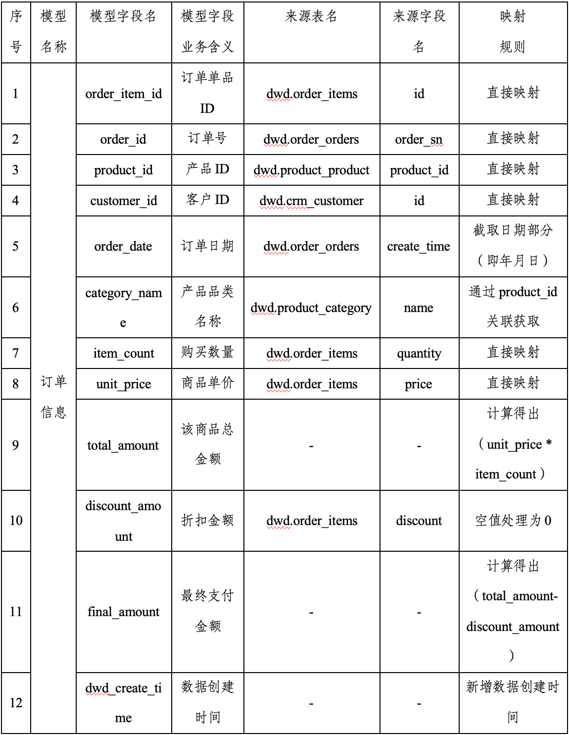 以电商场景中的交易主题为例,已设计了“订单信息”数据模型,其对应的数据库表名为dwd.order。为了完成“订单”模型的数据融合,制定的数据映射示例如下。
