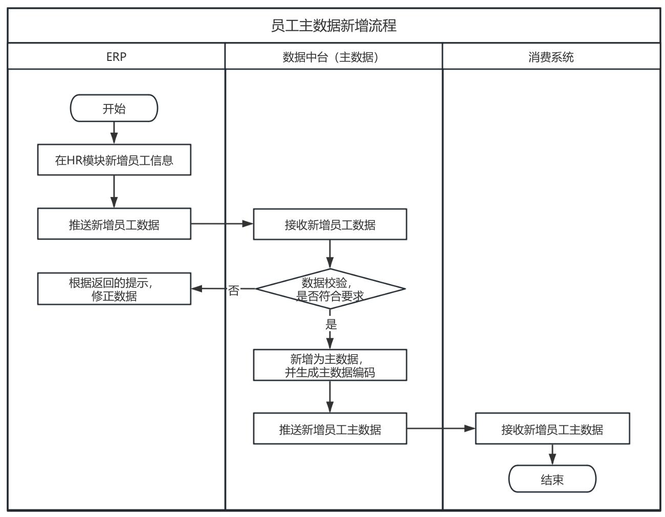 以某公司员工主数据新增为例,该主数据为单一来源,在ERP系统的HR模块新增,实时推送给数据中台的主数据模块校验。若符合主数据标准且尚不存在该员工信息,则新增为主数据,并推送给消费系统;否则,退回修正。流程示例如下。