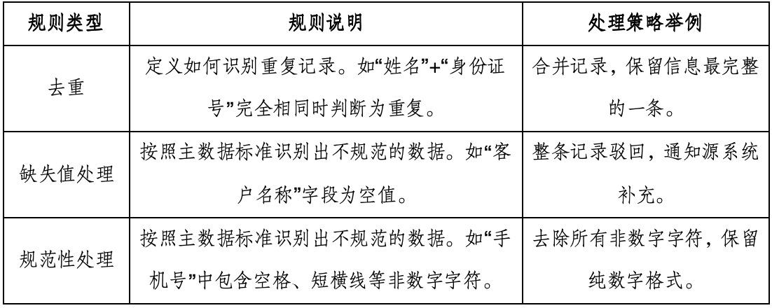 制定清晰、可执行的清洗规则是确保清洗过程有章可循、结果一致可控的基础。清洗规则要解决如何识别问题数据以及如何处理的问题。这些规则直接来源于主数据模型标准,涵盖了从基础格式到复杂业务逻辑的各个方面,如去重、缺失值处理、规范化处理等。