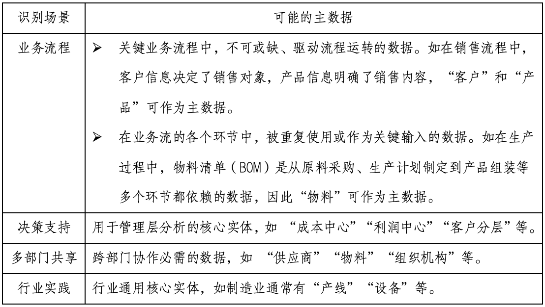 根据主数据高价值、高共享、实体独立性和唯一识别性的特征,可以从业务流程、决策报表、多部门共享和行业实践等场景中,识别组织的主数据。