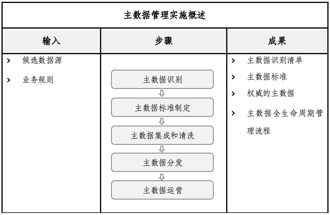 主数据管理的实施遵循“标准引领、运营保障”的思路,通过定义统一标准、整合并清洗主数据、构建分发模式、建立运维机制等措施,实现主数据全生命周期的闭环管理,确保数据在全企业范围内具有一致的理解和规范。