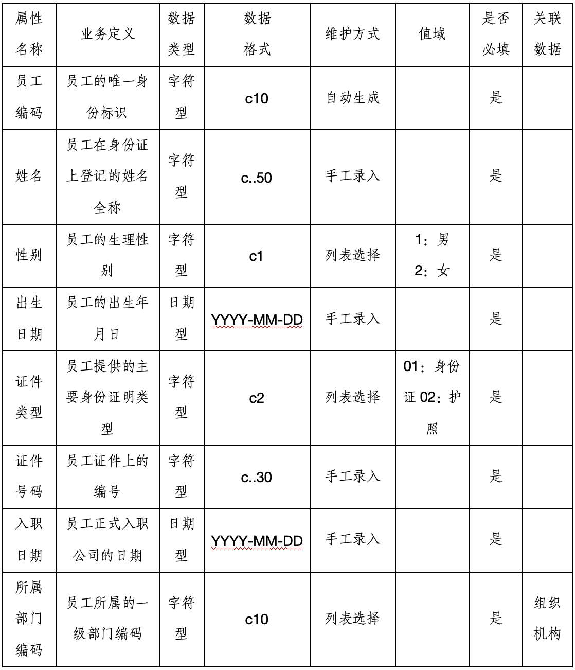 以员工主数据为例,其属性包括员工编码、姓名、性别、出生日期、证件类型、证件号码、入职日期、所属部门编号等。为每个属性制定明确的数据标准,包括数据类型、长度、格式、取值范围及必填性要求等。