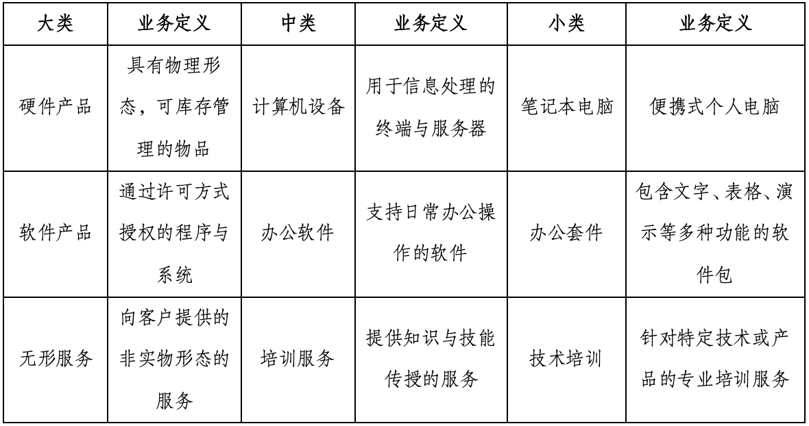 以某公司产品主数据为例,其产品分类体系首先依据自然属性划分为三大类:硬件产品、软件产品和无形服务。