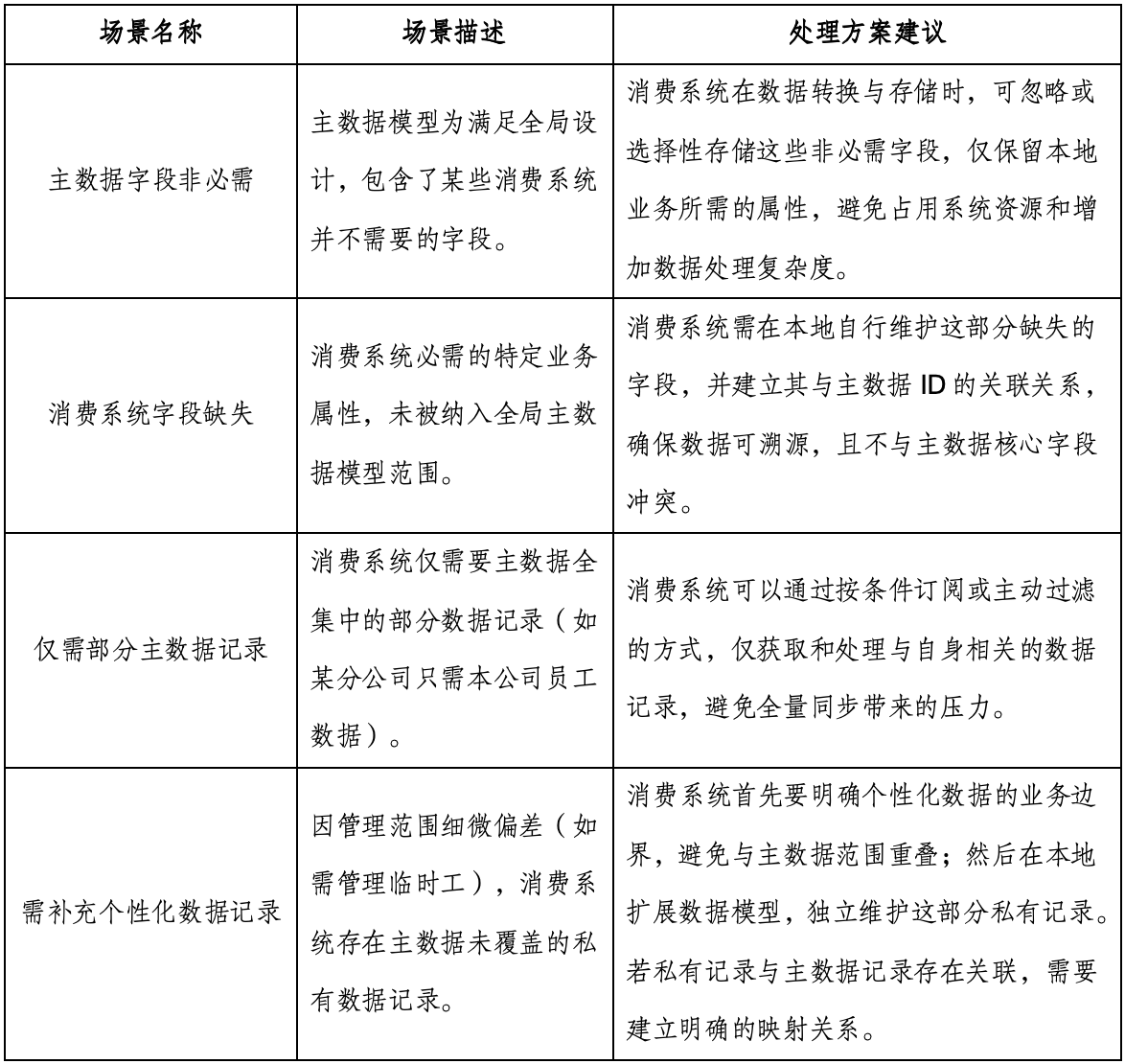 主数据模型因为需要兼顾全组织多系统共性需求,其字段、记录与单个消费系统的具体使用场景并非总是100% 契合,可能存在“主数据字段冗余”“系统自有字段缺失”“仅需部分主数据记录”“需补充个性数据”等场景。各消费系统在获取主数据后,应该在“建立并维护本地业务标识与全局主数据ID的稳定映射”的基础上,结合使用需求进行数据转换、补充和同步。
