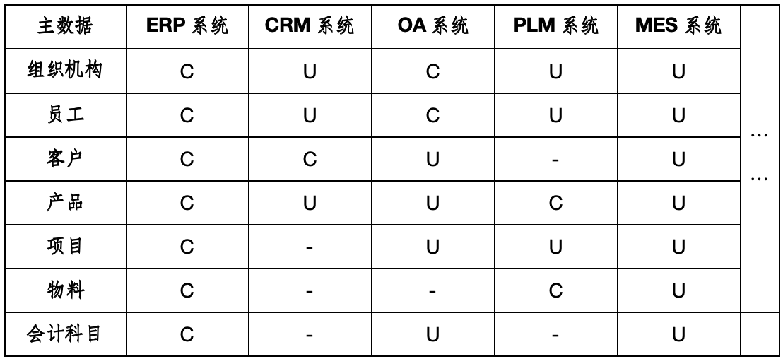 根据识别出的主数据清单,找到产生该主数据的一个或多个数据源,将业务实体对应到真实存在的业务系统上。同时,还需要识别出消费该主数据的业务系统,了解主数据在组织内的流转路径与使用场景,明确各系统间的数据依赖关系。IBM公司提出的U/C矩阵是一种有效的工具,用于分析主数据在各业务系统中的生成(C)与使用(U)关系。