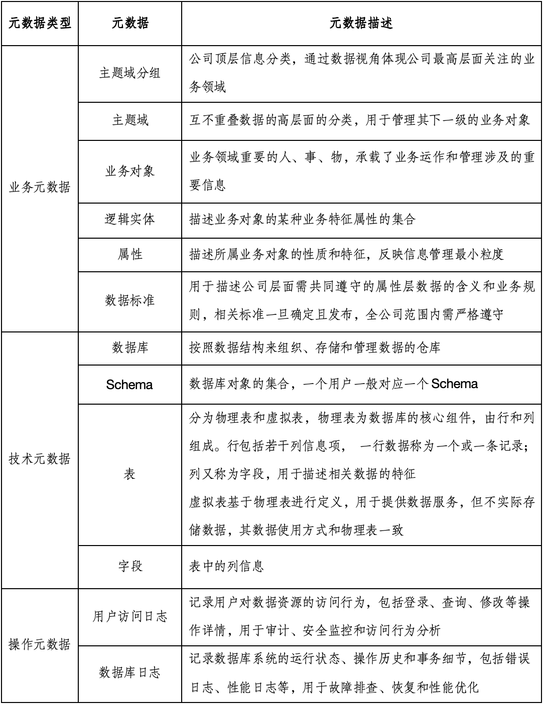 以华为元模型为例,它由业务元数据、技术元数据和操作元数据组成,其中业务元数据主要包含主题域分组、主题域、业务对象、逻辑实体、属性、数据标准等;技术元数据主要包含数据库、表、字段等;操作元数据主要是各类日志,如用户访问日志、数据库日志等。