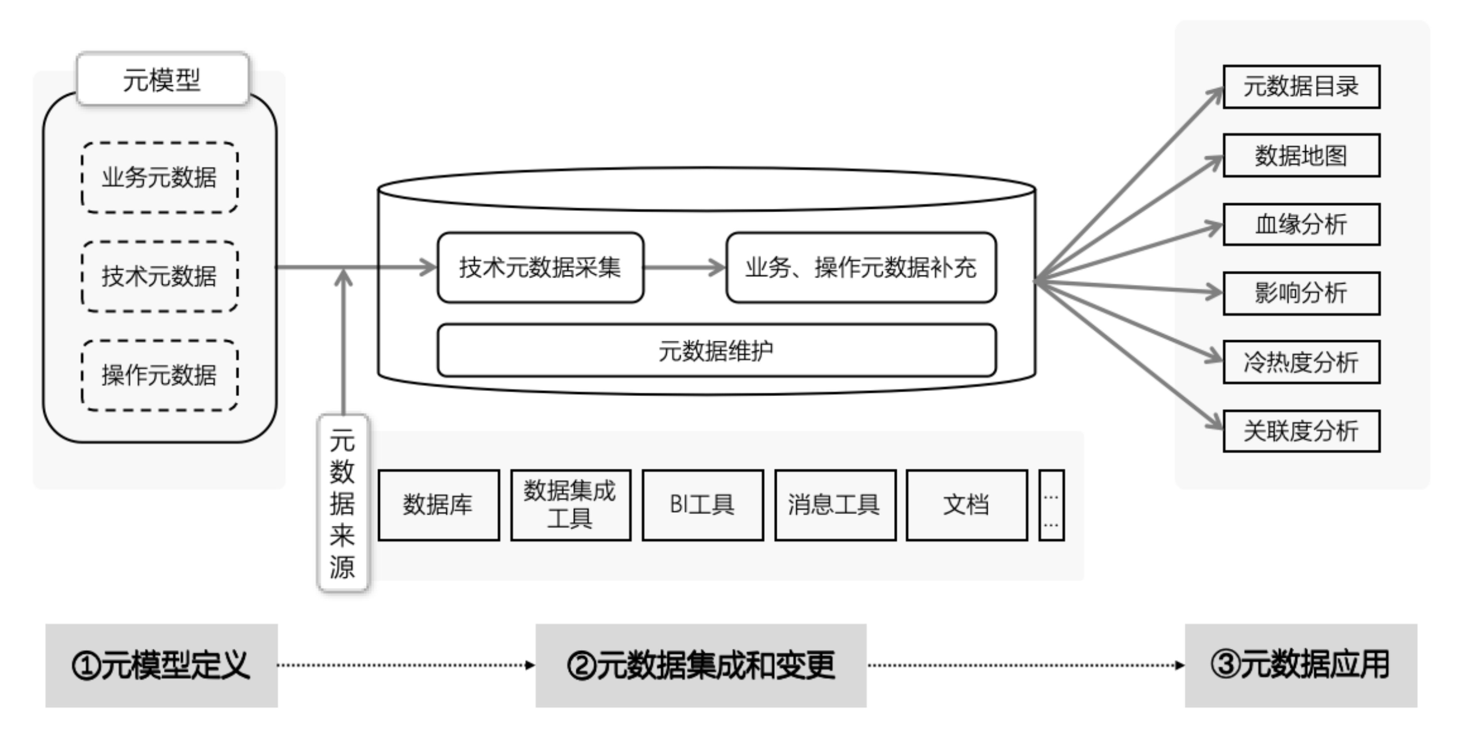 通过元数据需求分析明确业务目标和治理要求,在此基础上定义统一的元模型框架,覆盖业务、技术和操作三类元数据及其关联关系,为后续元数据集成和存储提供标准规范。
