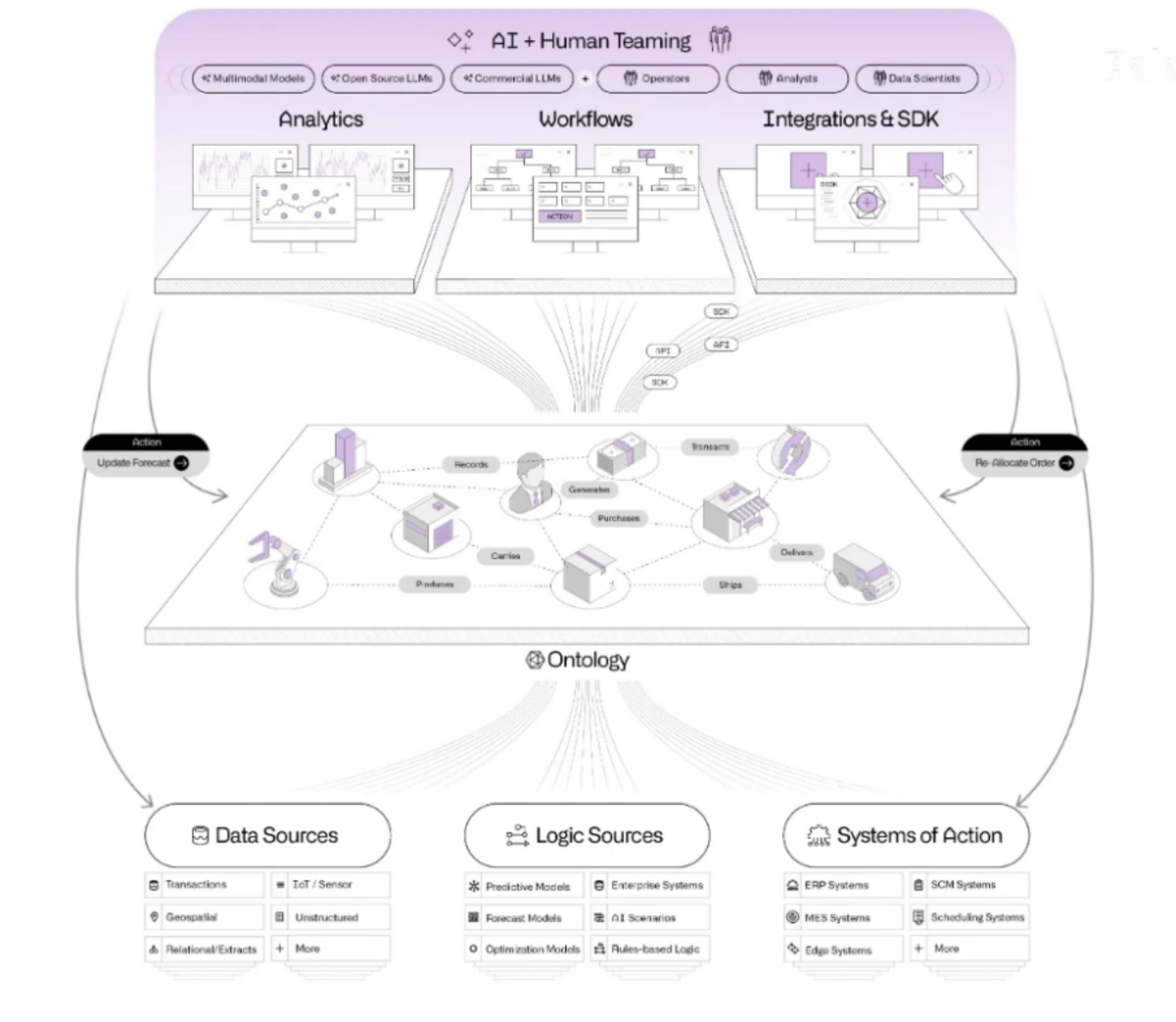 Palantir的独特性和创新性主要在于其提出的“本体论”(Ontology),本质是形成一个可执行、动态演化的业务语义层。Palantir对本体的定义为“构建和管理组织的数字孪生”,通过整合数据、业务逻辑、可执行的行动,将不同数据源映射为规范化的“对象”“关系”“操作”等元素,从而形成一个与现实业务对应的、可计算的动态知识图谱。Palantir将本体视为连接原始数据与业务逻辑的桥梁,它不仅关注数据结构,更强调数据所承载的业务行为与流程,从而实现了从静态数据表达到动态业务语义的跨越。
