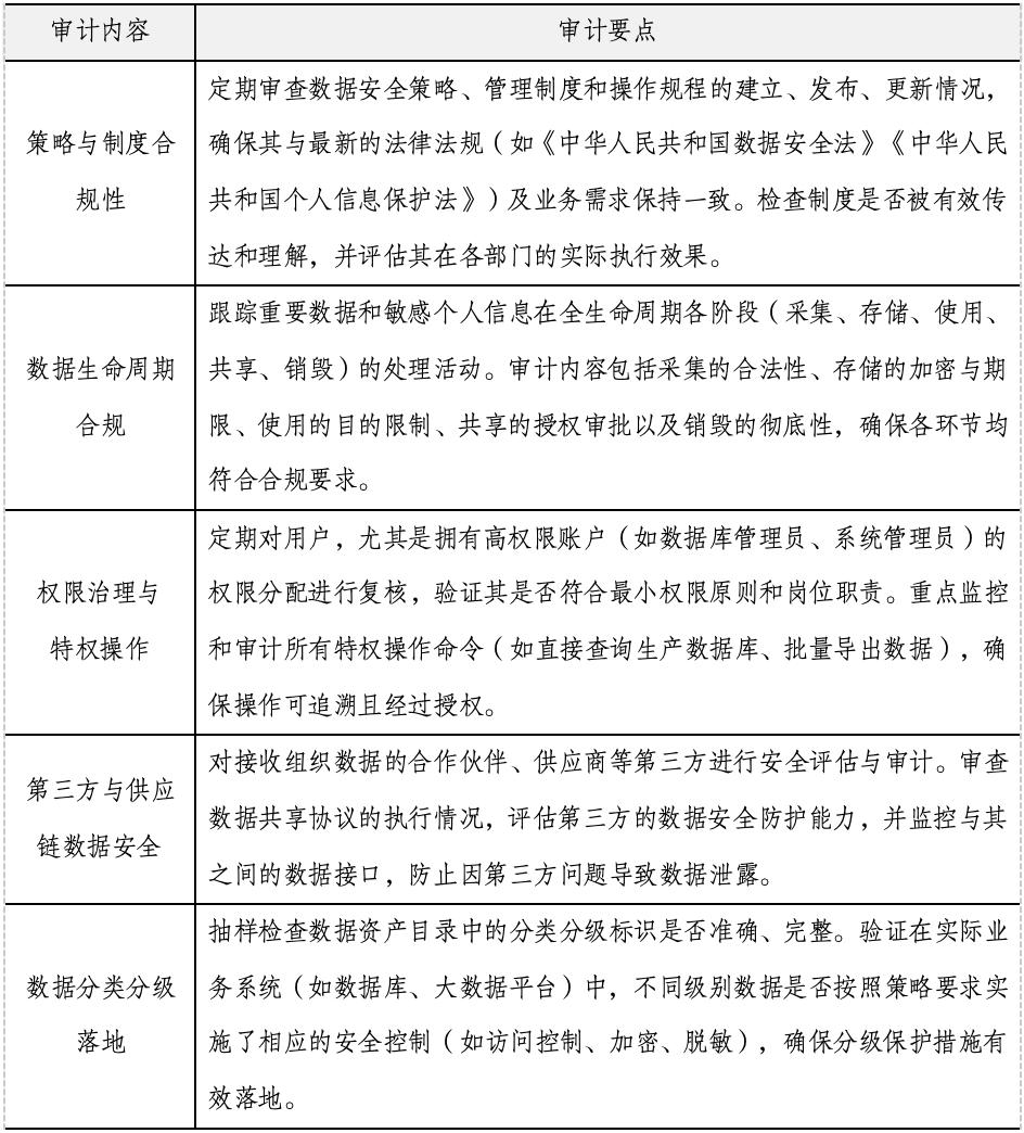 安全审计的内容,如策略与制度合规性、数据生命周期合规、权限治理与特权操作、第三方数据安全、数据分类分级落地等审计,参考示例如下。