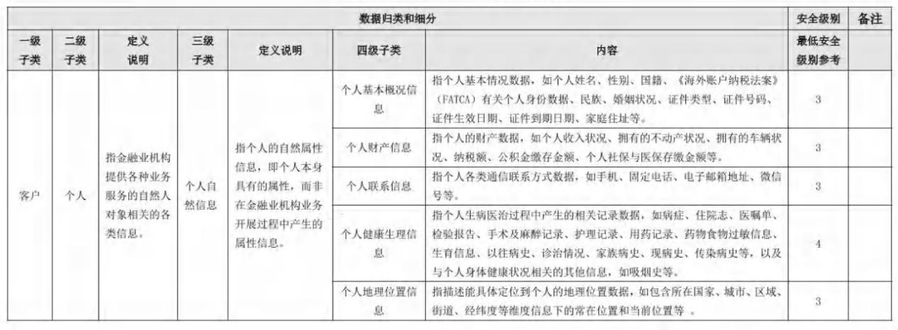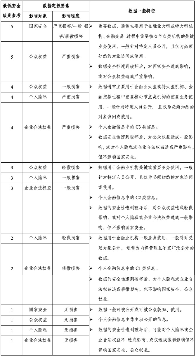 表 2 《JR/T 0197-2020 金融数据安全 数据安全分级指南》数据安全等级划分示例