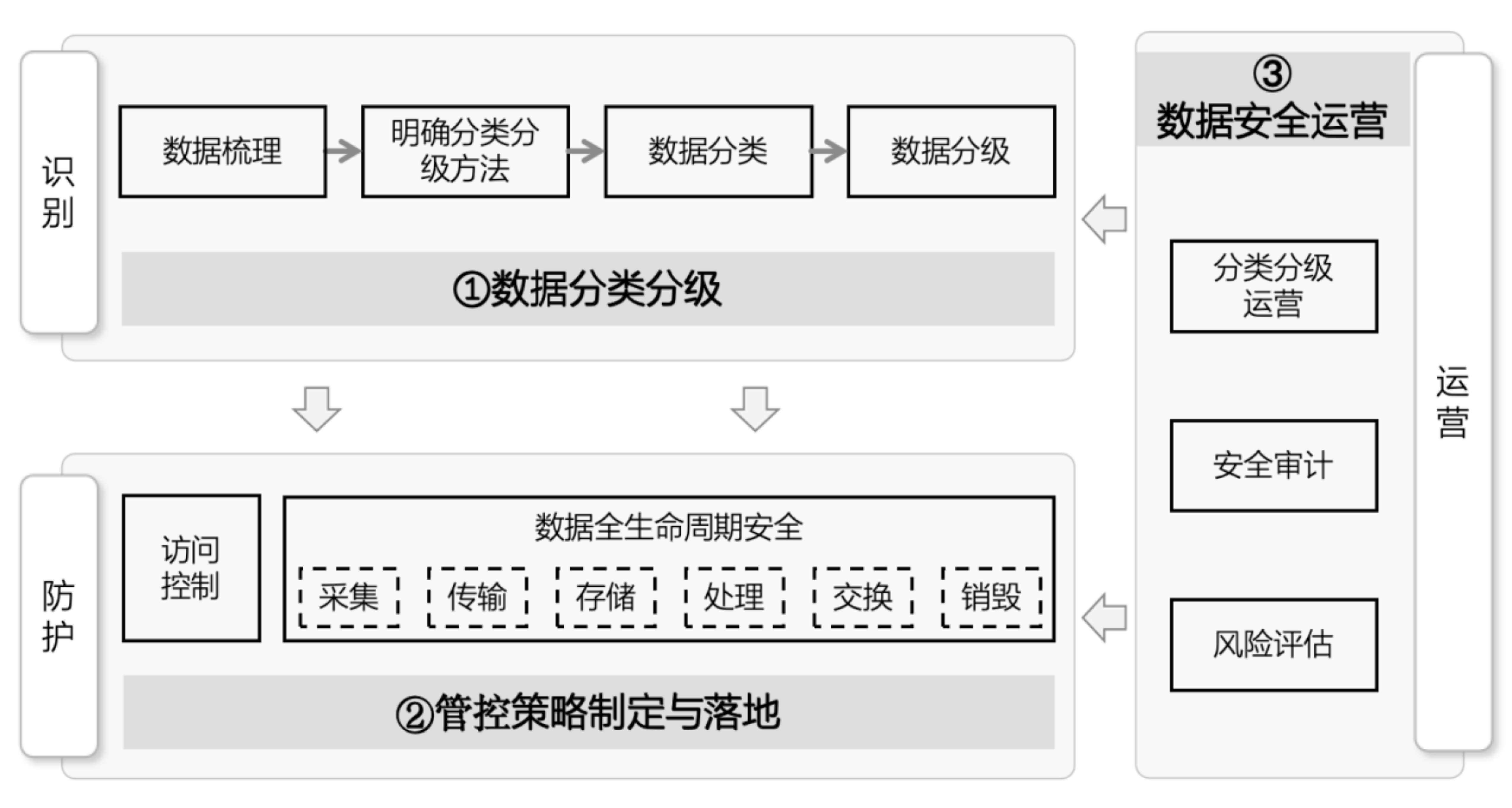 数据安全管理遵循“识别-防护-运营”的闭环逻辑,以数据分类分级为基础、安全策略为核心,并通过持续运营进行动态优化,来构建一个与业务深度融合、可度量和可演进的数据安全管理体系。