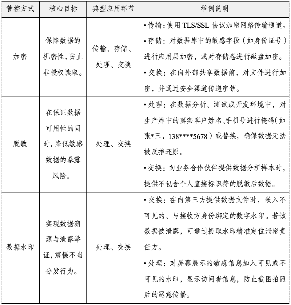 (5) 数据交换:需规范数据共享、发布的流程,明确外部数据接收方的安全能力要求,并采取数据水印等技术手段进行泄露溯源。