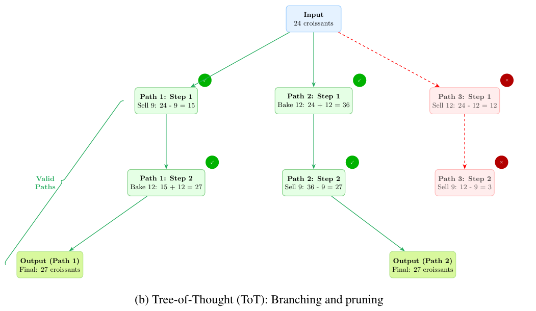 思维树(ToT):将推理视为搜索问题,允许模型同步探索多条并行推理路径(树的分支),评估后剪枝低潜力路径,实现解空间的系统性探索(图5b