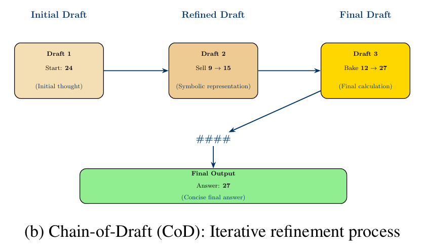 草稿链(CoD):该风格追求简洁性,约束模型生成凝练的符号化推理轨迹,通过迭代优化解决方案“草稿”。通过少样本示例引导,输出形式如,该过程如图4b