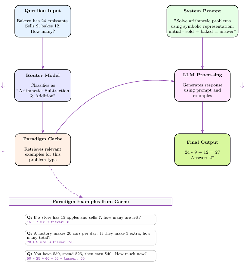 思维草图(SoT):采用巧妙的两阶段处理:首先由训练的“路由模型”识别问题类型,随后检索该类问题的解决范例来增强提示。在保持透明度的同时鼓励符号化简答,如图6