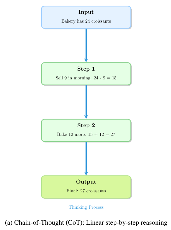 思维链(CoT):作为基础技术,它要求模型将问题分解为线性步骤序列,类似于人类展示解题过程。通过生成显式推理轨迹,该方法简单有效。示例可参见图4a