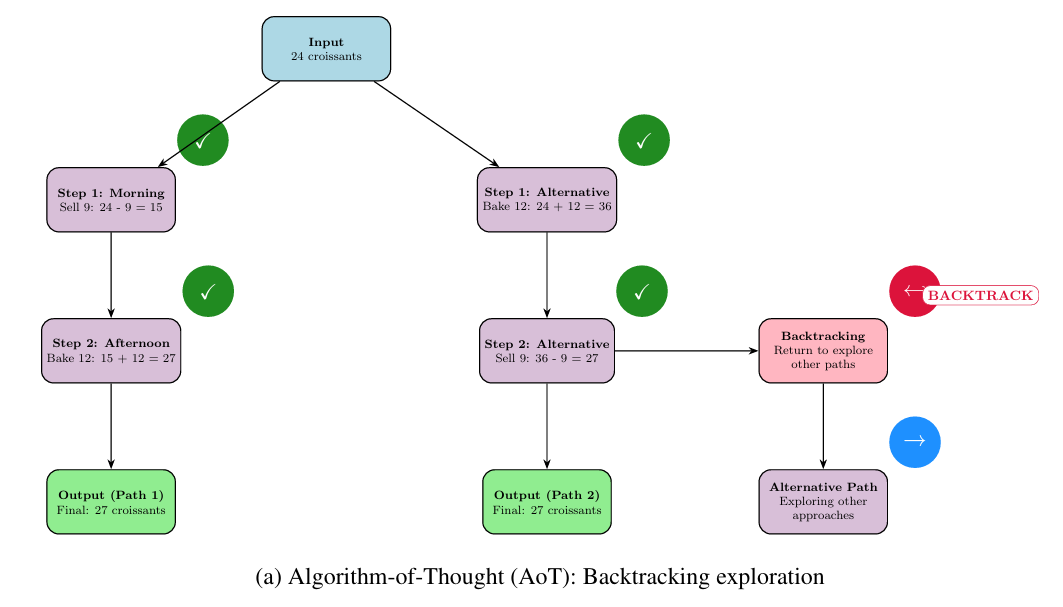 算法思维(AoT):受经典算法启发,该方法实现回溯搜索,使模型能够撤离无效推理路径并探索替代方案,通过避免死胡同有效模拟算法化问题解决(图5a