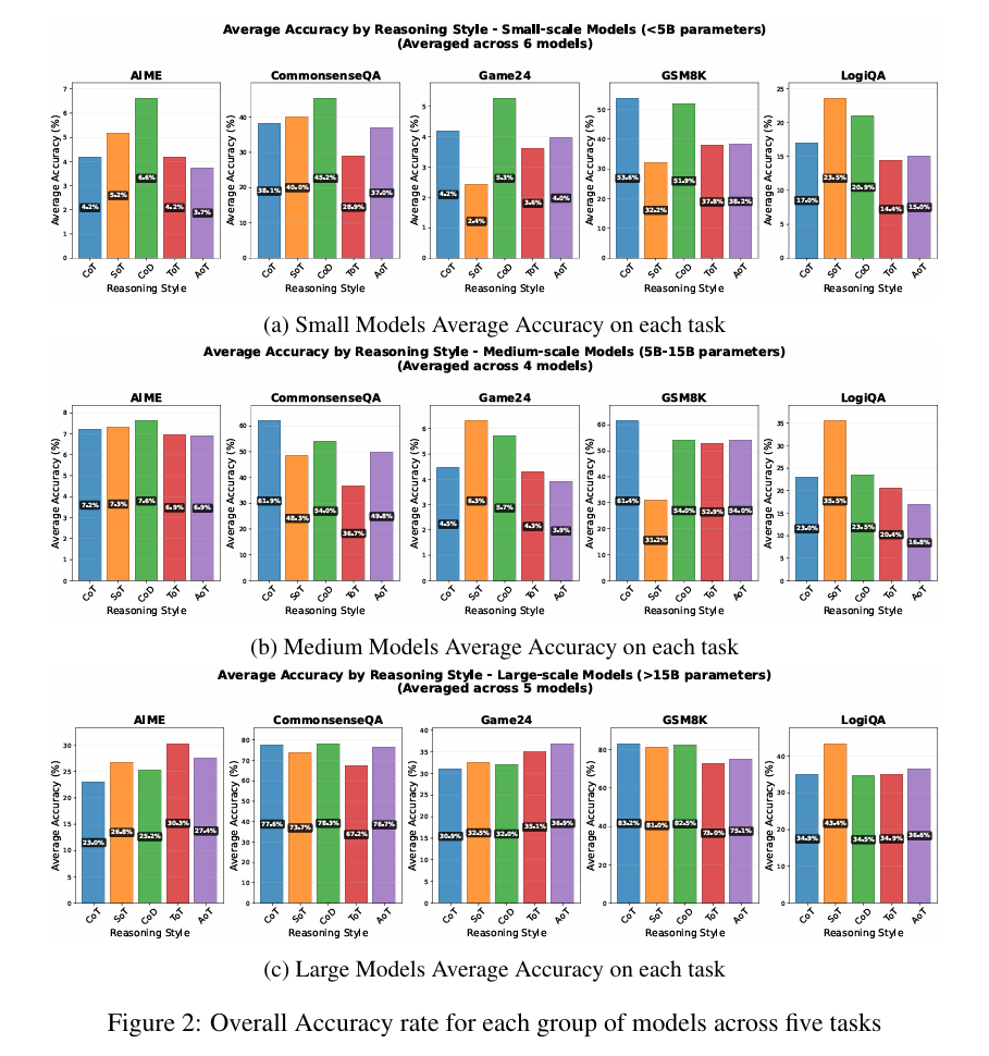 StyleBench对五种代表性“思维风格”进行分类评估,每种风格以不同方式构建模型的问题解决流程。理解这些风格是释放LLM全部潜能的关键。图1