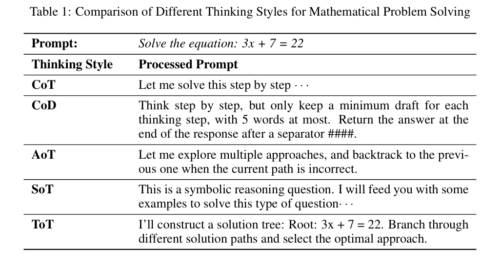 早期突破性技术如思维链(CoT)表明,仅需要求模型进行逐步思考,就能显著提升其数学和逻辑问题的解决能力。此后,更复杂的技术呈现寒武纪式爆发,形成了并行推理路径、迭代草稿甚至算法回溯等多元方法。然而,这些不同推理风格、特定LLM与任务性质之间复杂的相互作用仍未被充分理解。这留下了一个关键问题:如何为特定任务选择正确的思维风格,以实现性能与效率的最佳平衡?