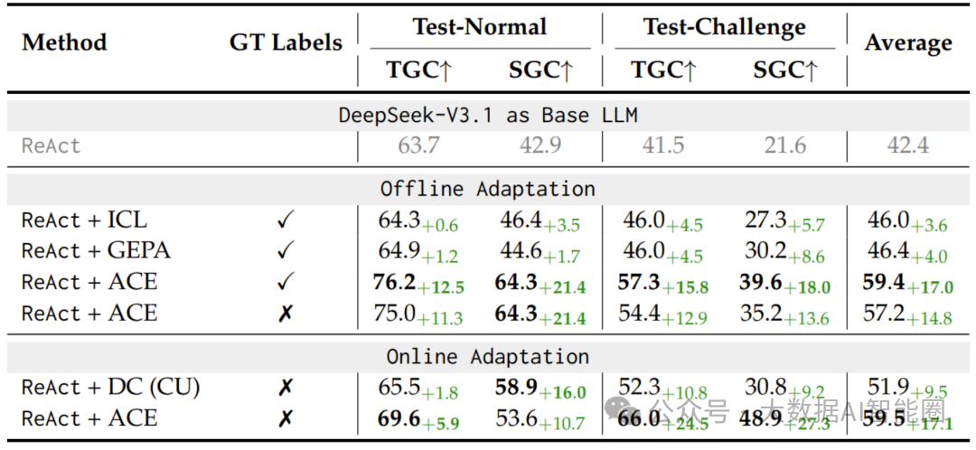 在AppWorld基准测试中,ACE的表现堪称惊艳:无需任何标注数据,仅凭执行反馈就能让开源小模型性能提升17.1%