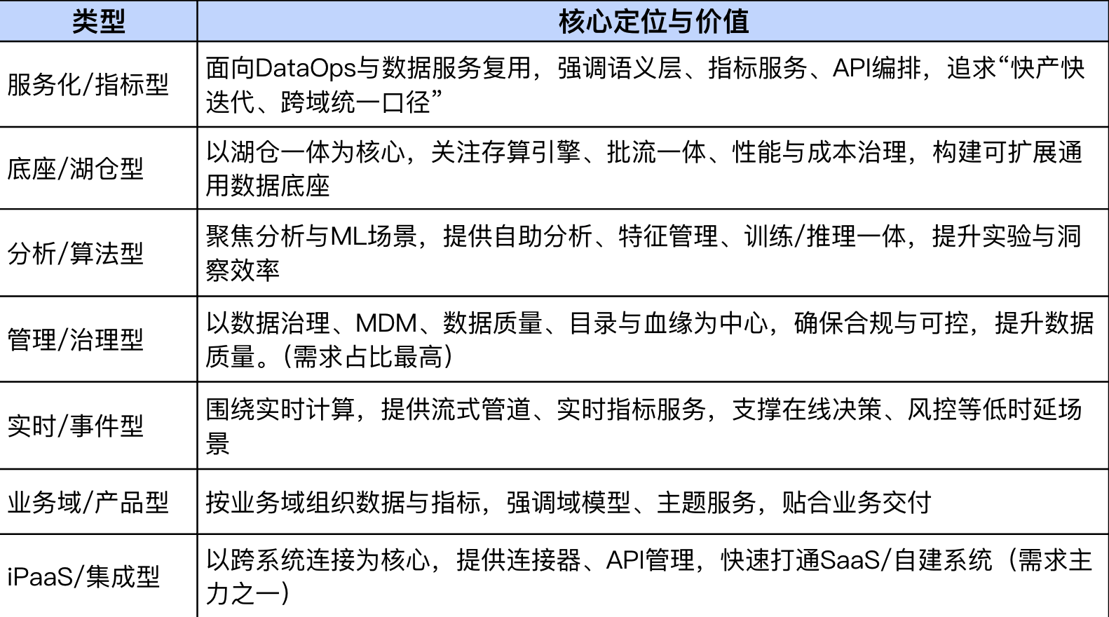 龙石数据市场端数据显示,管理/治理型(占比最高)、iPaaS/集成型、底座/湖仓型构成需求主力。