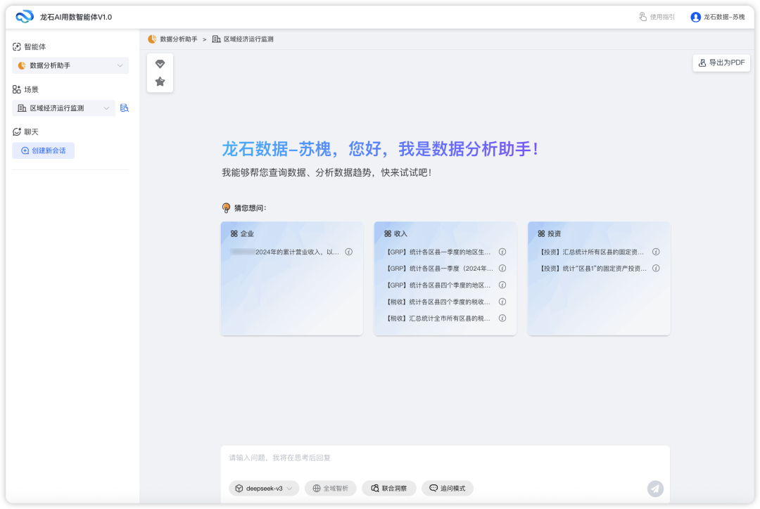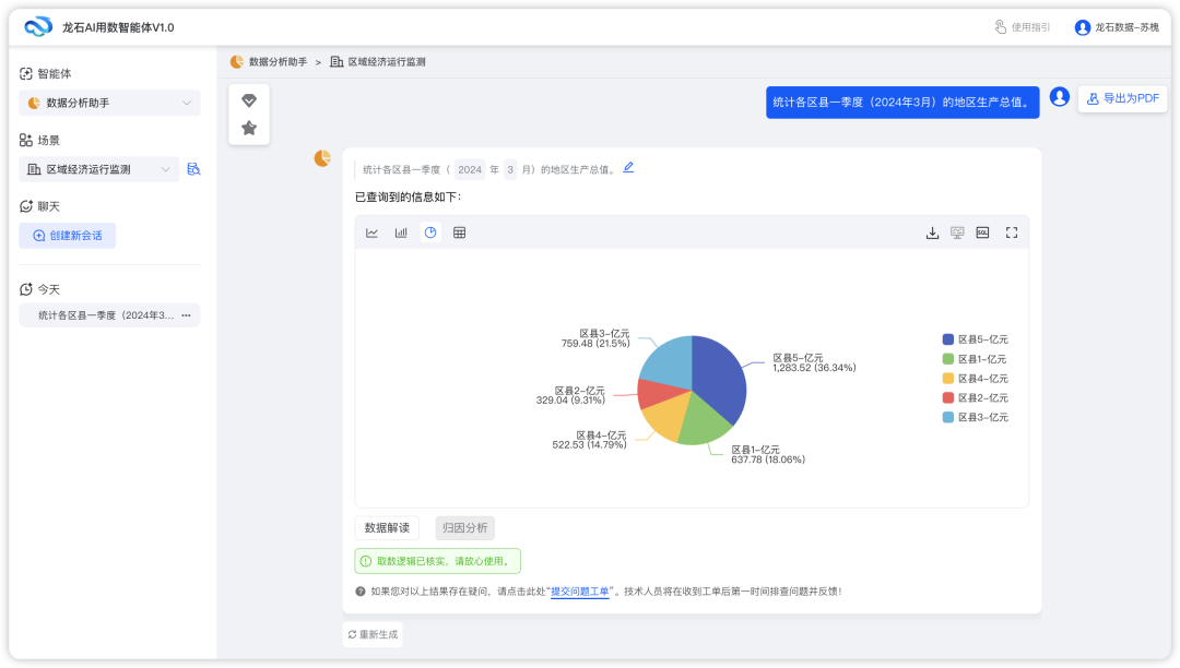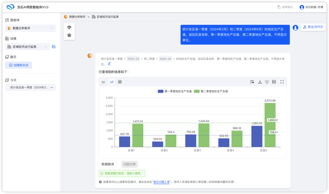 用户只需用自然语言描述数据需求(如"查询2024年各地区的生产总值"、"分析本季度销售趋势"等),AI用数智能体即可自动理解用户意图,将自然语言转换为标准SQL查询语句,调用数据仓库获取查询结果。