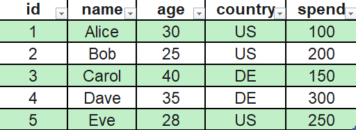 查询: “美国客户总消费额”→ 仅需要列country和spend