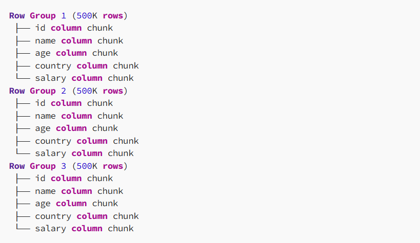 💡注意:每一列(例如,country)并没有存储在整个文件的单个连续块中,而是作为每个行组中的单独列块存储。