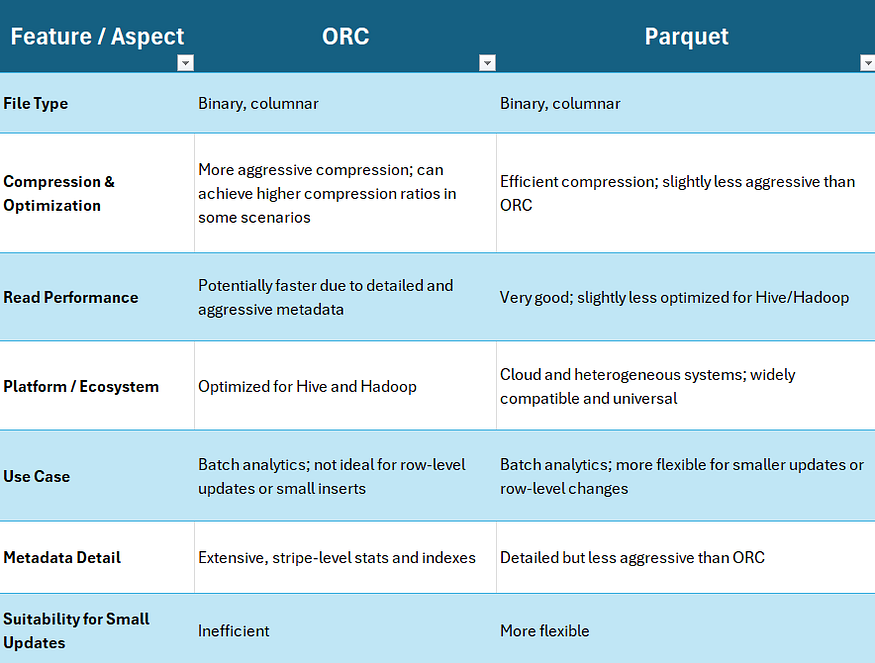 这两种文件类型都是二进制、列式存储,并且在许多方面都使用非常相似的方法。然而,它们在某些方面也存在差异。首先,ORC 格式的优化更为激进。因此,在某些情况下,ORC 格式可以获得更好的压缩效果,并且由于其元数据更详细、更全面,因此也能提供更好的读取性能。