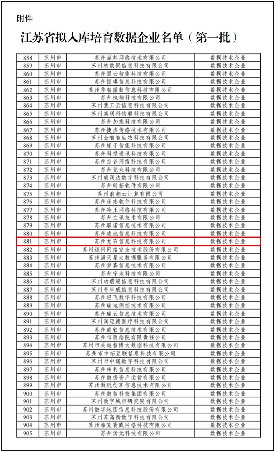 经过企业自主申报、地市数据主管部门初审、省级复审及公示等严格程序,苏州龙石信息科技有限公司(简称:龙石数据)凭借在数据技术领域的扎实积累与突出实力,成功入选江苏省首批入库培育企业行列。