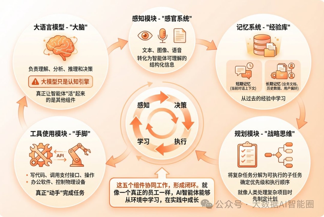 一个完整的AI智能体系统包含五个核心组件,每个都发挥着不可替代的作用。