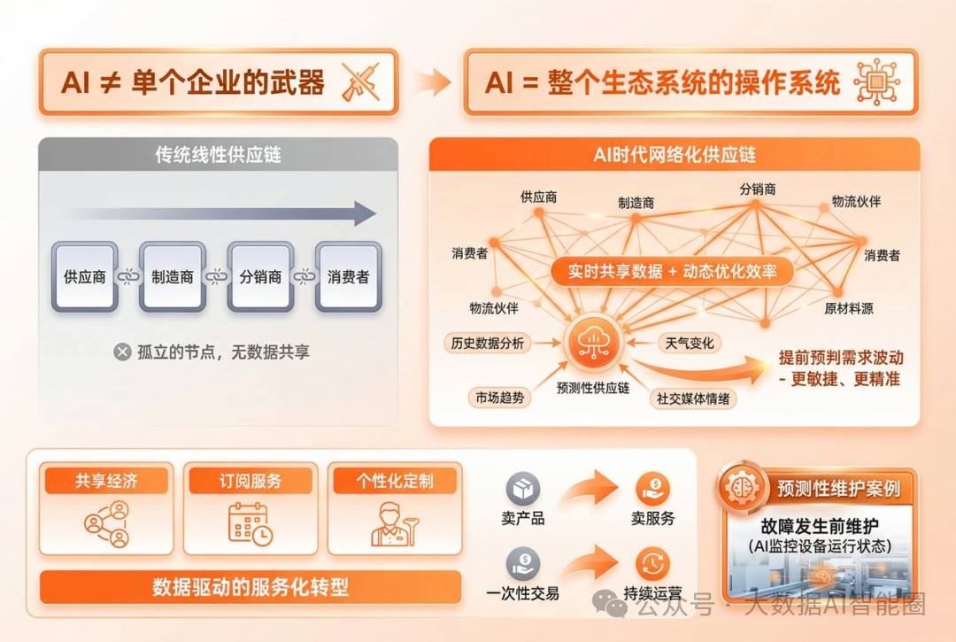 AI时代的供应链变成了网络化的:每个节点都在实时共享数据,动态优化整个链条的效率。