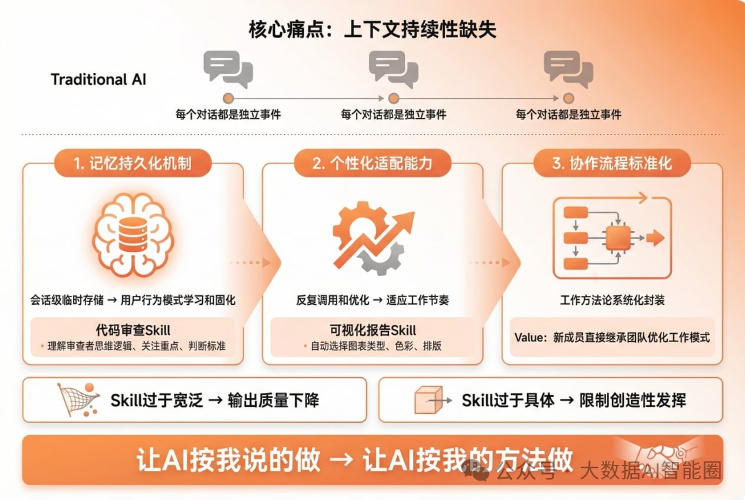 Claude Skills的核心价值在于它解决了AI应用中最容易被忽视的痛点:上下文持续性的缺失。