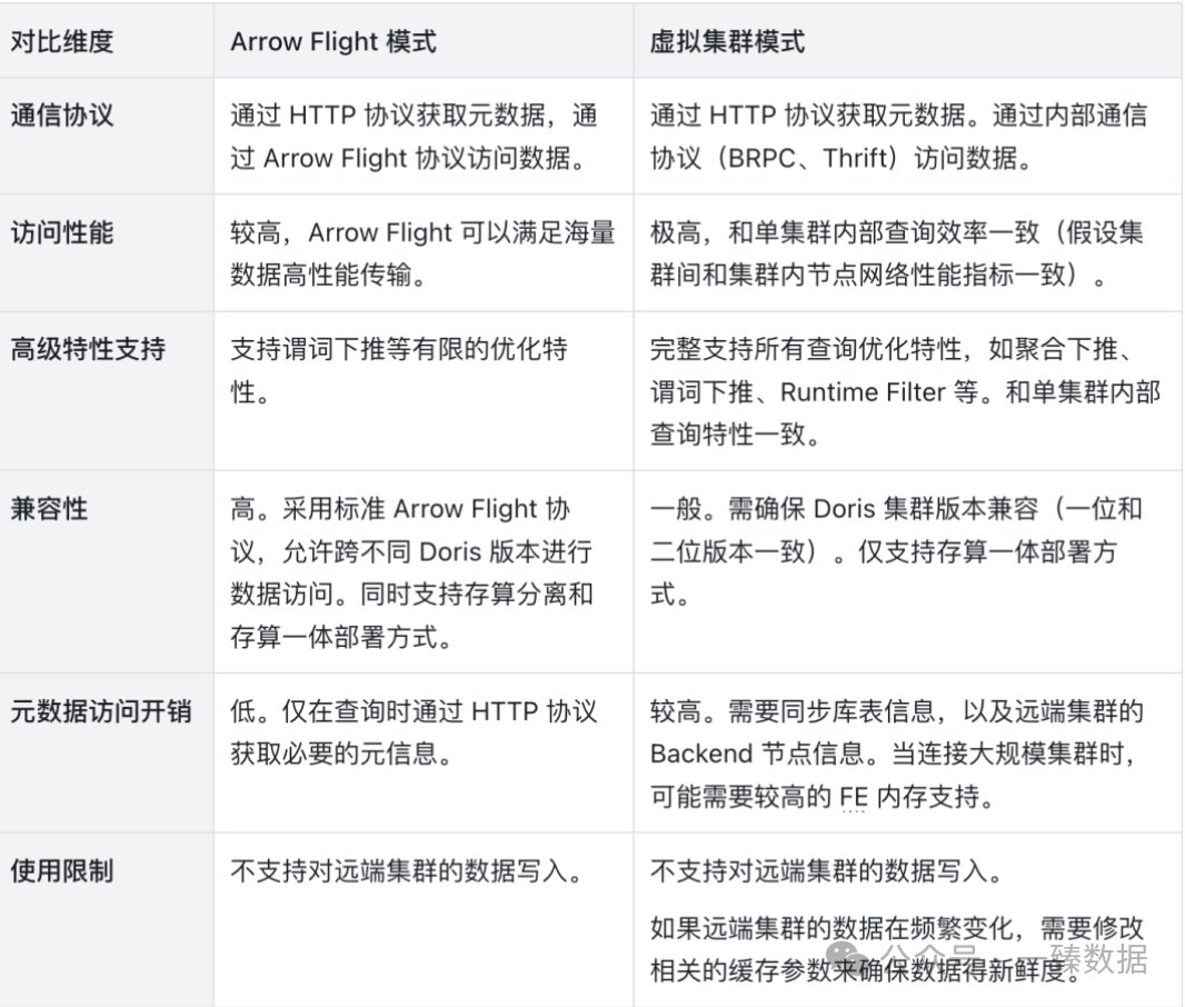 还有一个考虑因素是集群版本。如果你的多个Doris集群版本不一致,用Arrow Flight模式更稳妥,兼容性更好。