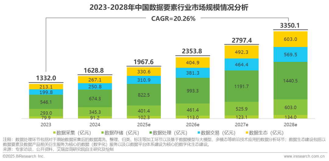 近年国内数据要素产业发展呈现稳步增长态势,中国数字经济规模由2017年的27.2万亿增长至2023年的53.9万亿,六年整体规模翻了一倍,复合增长率约为12.07%。2024年以数字产品制造业、数字技术应用业为代表的数据经济核心产业增加值达到13.49万亿元,约为同年期GDP的10%,成为推动国内经济整体发展的重要驱动力。随着数据产业标准化体系的完善、创新案例与产业试点规模的扩充以及服务前沿技术场景的外延价值提升,国内数据要素行业规模将以约20.26%的复合增长率保持高速增长,预计2025年整体规模将达到2000亿左右,2028年将正式突破3000亿。其中以数据加工与分析为核心的数据处理环节,将成为数据要素产业规模占比最高的细分产业,预计2028年其整体规模即将达到1440亿元。