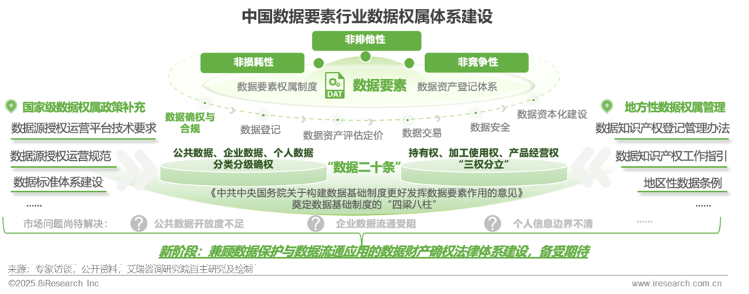 随着数字经济的发展与数字中国战略的实施,数据作为“第五大生产要素”其资产化流通链路的完善与价值释放体系的建设成为当前国内市场的关注重点,清晰的数据要素权属制度与统一的数据资产登记体系将成为保障数据要素价值链建设的重要前提。但由于数据资产的非损耗、非排他与非竞争属性,导致传统生产要素的分配模式无法在数据要素市场套用,建立专属于数据资产的权属划分体系成为推动行业发展的“当务之急”。自2022年国务院颁布“数据二十条”政策以来,国内数据要素的确权制度体系开始逐步完善,“数据二十条”政策不仅明确了以公共数据为代表的三大数据源的分类分级确权制度,还将数据资源的持有权、加工使用权与产品经营权进行了划分,力求保障数据价值链每位参与者的固有权益,为建设合规高效的数据流通交易制度与安全可控的数据治理体系奠定基础,后续国家发改委、国家数据局及各地方数据管理机构陆续颁布了围绕数据管理、数据资源授权与数据知识产权登记等条例,进一步完善国内数据市场确权、登记体系。但在实践过程中,公共数据开放度不够、企业数据流通受阻、自产自用以及个人数据信息边界不清、合规使用标准模糊等问题依旧存在,此外单一维度的数据分类也难以兼顾大数据时代下对于数据安全、经济效率与公共利益的三方追求,执行稳定性与刚性更强、适配于多样化应用场景的数据要素权属法律体系建设,成为新时代改善确权矛盾、提升数据使用效率的关键。