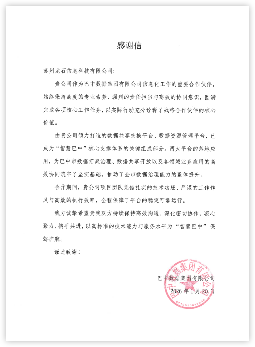 前几日,苏州龙石信息科技有限公司(以下简称 “龙石数据”)喜获多方感谢。一日之内接连收到巴中数据集团有限公司、吴江区市场监督管理局、江阴市市域社会治理现代化指挥中心的三封感谢信。