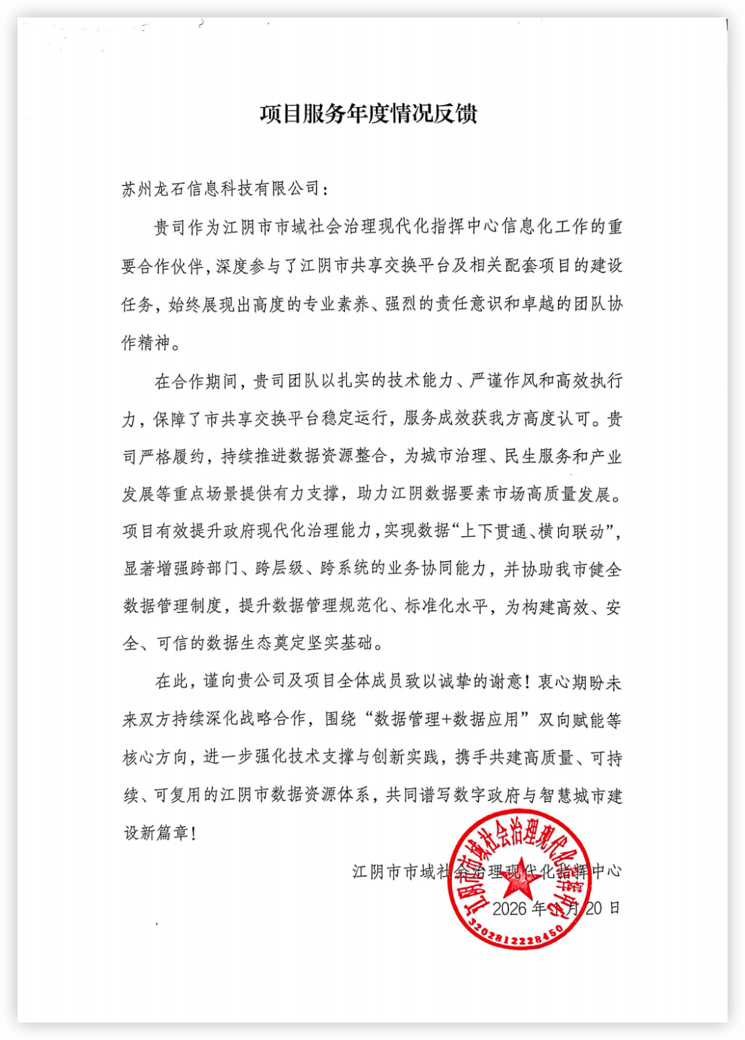 三份信函字里行间的诚挚赞许,既是对公司政务数据治理服务成效的高度肯定,也是对龙石团队坚守专业、赋能发展的有力佐证。
