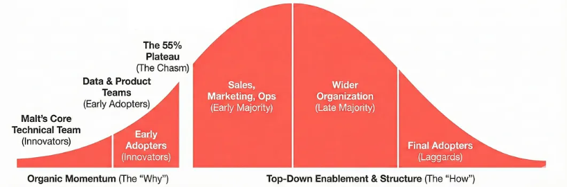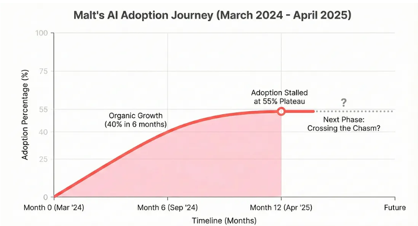 简而言之:Malt内部的AI转型并非始于董事会的战略规划或巨额预算,而是始于五个人,他们看到了别人眼中只有任务却蕴藏的巨大潜力。本文讲述了我们如何凭借这股自发的力量将AI采用率提升至55%,以及为什么这还远远不够。
