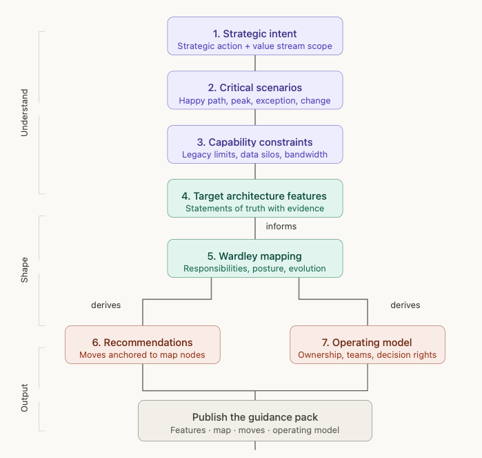 一套完整的指导方案包含四部分。首先,提供目标架构特征及其证据,明确架构必须具备的不可协商属性,每项属性都对应一份合同、服务级别目标 (SLO) 或一致性检查,以确保其可控性。其次,提供一份沃德利图,清晰地阐明所有权归属、边界划分以及必须保持一致的接口。第三,提供以权衡取舍的方式提出的建议,明确行动步骤、停止事项、标准化流程和行动顺序,并清晰地列出每项行动的成本和收益。第四,提供一份运营模式概览,明确责任人、团队类型、交互模式以及一致性管理方式。