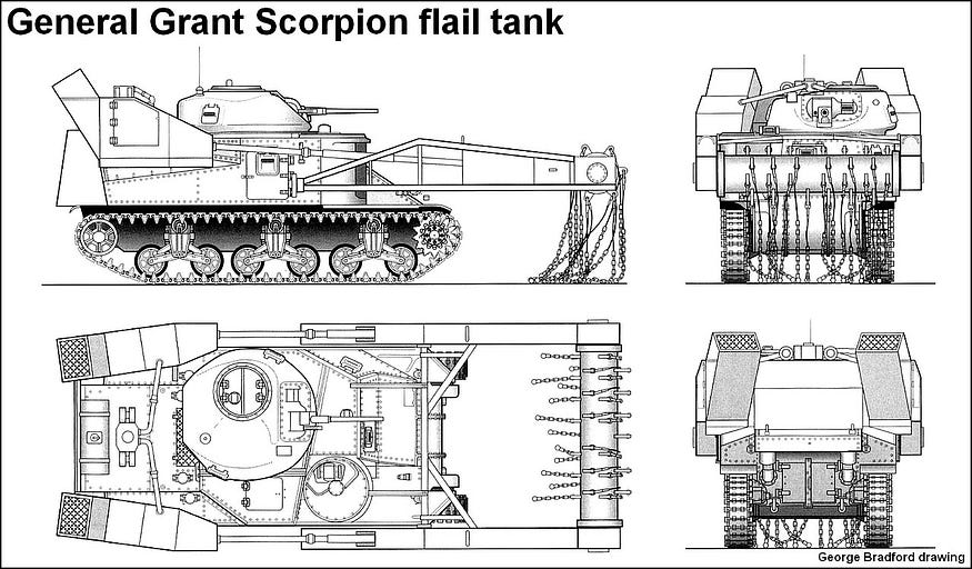 其中最著名的当属连枷坦克。一个装有重型链条的旋转滚筒会敲击坦克前方的地面,在地雷被坦克自身重量触发之前将其引爆。这套装置确实有效。但其缺点是经过深思熟虑的:连枷会遮挡驾驶员的视线,降低速度,并且意味着在排雷作业期间无法开火。生存能力的提升是以牺牲进攻能力为代价的。