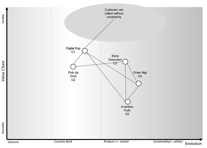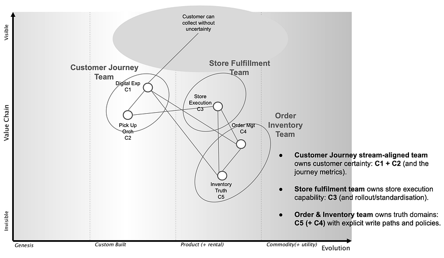 设想一家零售商正在构建线上订购线下取货(click and collect)服务。沃德利地图(Wardley map)立即揭示了一个有用的区别:定义“准备就绪”、“延迟”和“已取货”含义的编排层,即每个渠道、门店和客服人员所依赖的规范状态模型,牢牢地位于定制开发区域。客户的确定性要么在此得到保障,要么在此受到损害。它应该作为一项持续的产品功能进行投资,而不是一个项目。